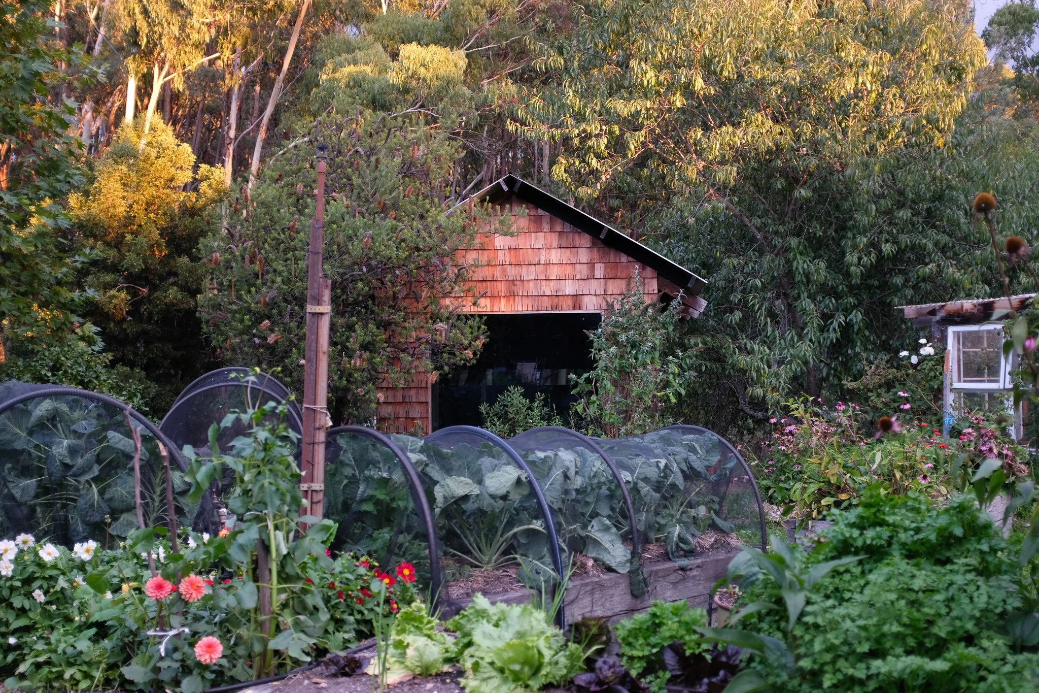 six - the tomatoes have started ripening, Finally. And slowly. But the amount of green tomatoes still to turn red is enormous. We’ve set up some hoops and we’ll cover them with plastic when the nighttime temperature is below 10 to protect them and try to hold onto the heat, but I’m growing impatient and concerned.