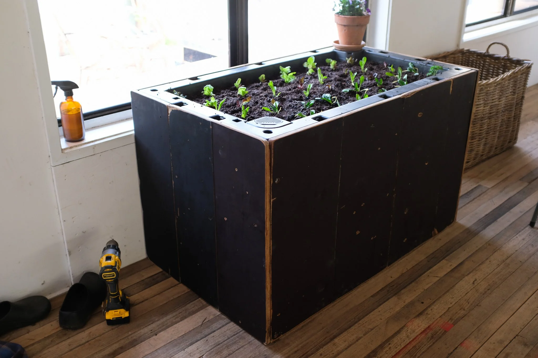 First Bren built a cover for a wicking bed, then we filled the bottom up with water, and filled the rest up with a mixture of coir (coconut fibre) and sifted compost.